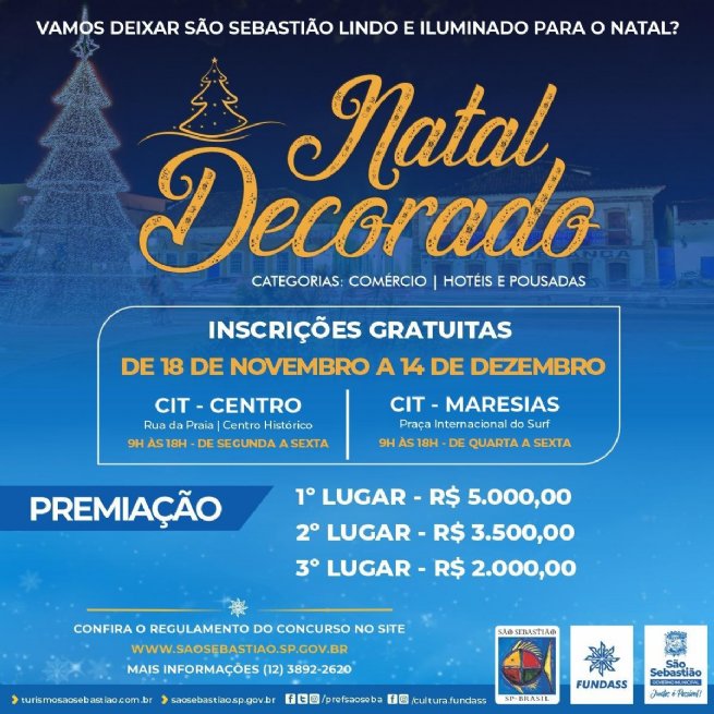 A Prefeitura de São Sebastião, por meio da Secretaria de Turismo (SETUR) e da Fundação Educacional e Cultural “Deodato Sant’Anna” (Fundass), informa que as inscrições do Concurso Natal Decorado em São Sebastião 2020, nas categorias “Comércio” e “Hotéis e Pousadas”, foram prorrogadas até o dia 14 de dezembro.
