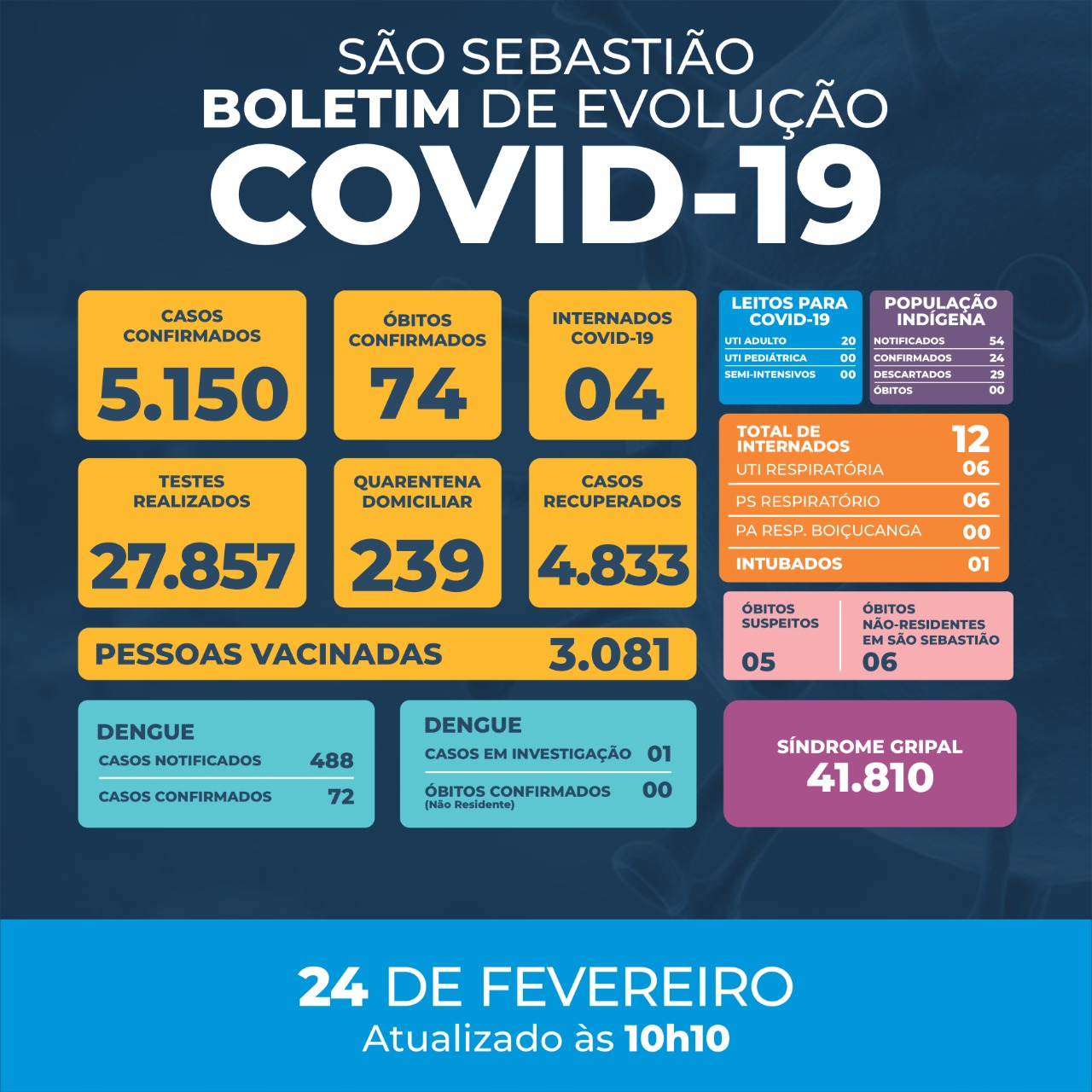 Ao afirmar que São Sebastião cumprirá a determinação do governo estadual, o prefeito lembrou os números positivos da cidade. O município está, nesta quarta-feira (24), com apenas seis pessoas internadas, um intubado e taxa de recuperação de 93%.