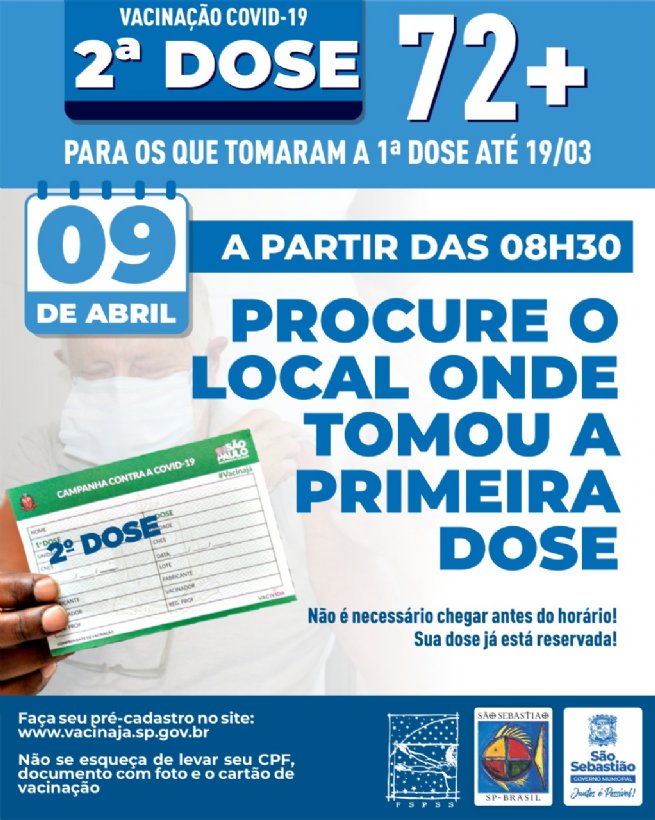 Nesta sexta-feira (09), a Prefeitura de São Sebastião, por meio da Secretaria de Saúde (SESAU) e da Fundação de Saúde Pública (FSPSS), fará a campanha da segunda dose de imunização contra Covid-19 para as pessoas com idade de 72 anos ou mais, que tomaram a primeira dose até o dia 19 de março.