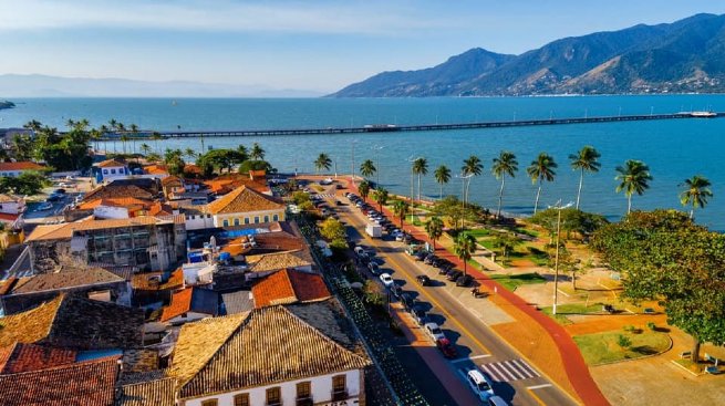 #PraTodosVerem: Imagem aérea do Centro Histórico de São Sebastião. Arte gráfica com os nomes dos destinos finalistas na categoria Turismo Responsável do Prêmio Internacional Passaporte Aberto 2020. Fim da descrição.