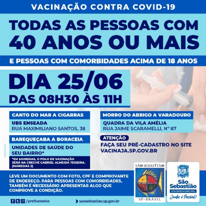 A Prefeitura de São Sebastião, por meio da Secretaria de Saúde (SESAU) e da Fundação de Saúde Pública (FSPSS), vacina contra a Covid-19 todas as pessoas com 40 anos ou mais nesta sexta-feira (25). Pessoas de 18 anos ou mais com comorbidades, que ainda não receberam a primeira dose do imunizante, também serão vacinadas.