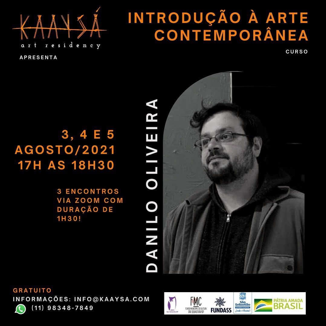 Nos dias 3, 4 e 5 de agosto, das 17h às 18h30, o Espaço Cultural Kaaysá Art Residency promove gratuitamente o curso online “Introdução à Arte Contemporânea”, ministrado pelo artista, professor e pesquisador, bacharel e Mestre em Artes Visuais pelo Instituto de Artes da UNESP, Danilo Oliveira.