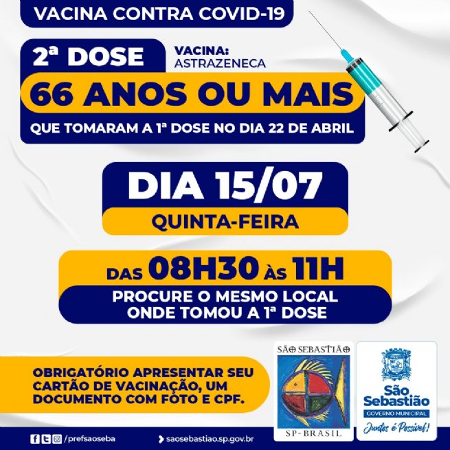 A Prefeitura Municipal de São Sebastião, por meio da Secretaria Municipal de Saúde (SESAU) e da Fundação de Saúde Pública (FSPSS), informa que nesta quinta-feira (15) o público-alvo da campanha de vacinação contra a Covid-19 serão os idosos com 66 anos ou mais que receberam a primeira dose do imunizante no dia 22 de abril. A vacina aplicada será a Astrazeneca, mesma da primeira dose.