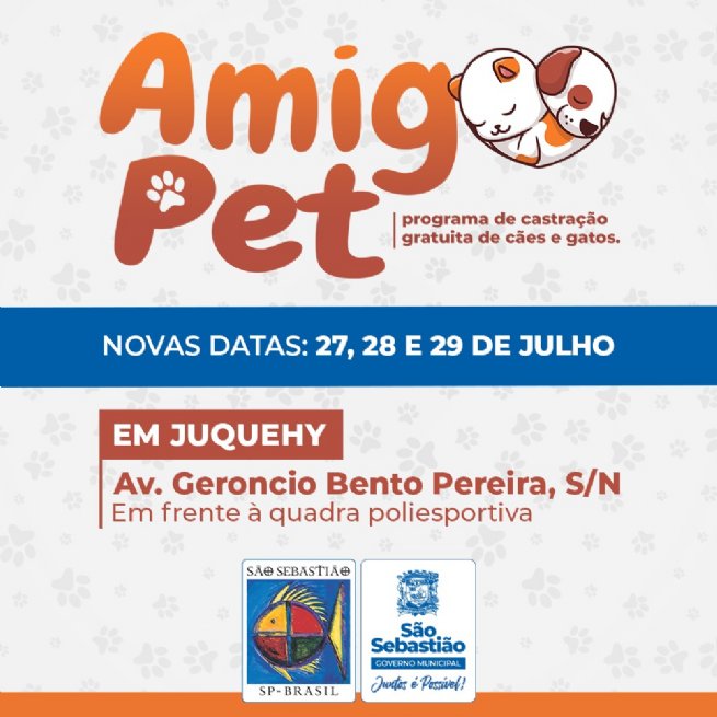 A edição de Juquehy do programa de castração gratuita Amigo Pet será esta semana, entre os dias 27, 28 e 29 de julho (terça a quinta-feira). As cirurgias acontecerão a partir das 8 horas, na Av. Geroncio Bento Pereira, s/n, em frente à quadra poliesportiva. A previsão é castrar cerca de 120 animais, entre cachorros e gatos, machos e fêmeas.