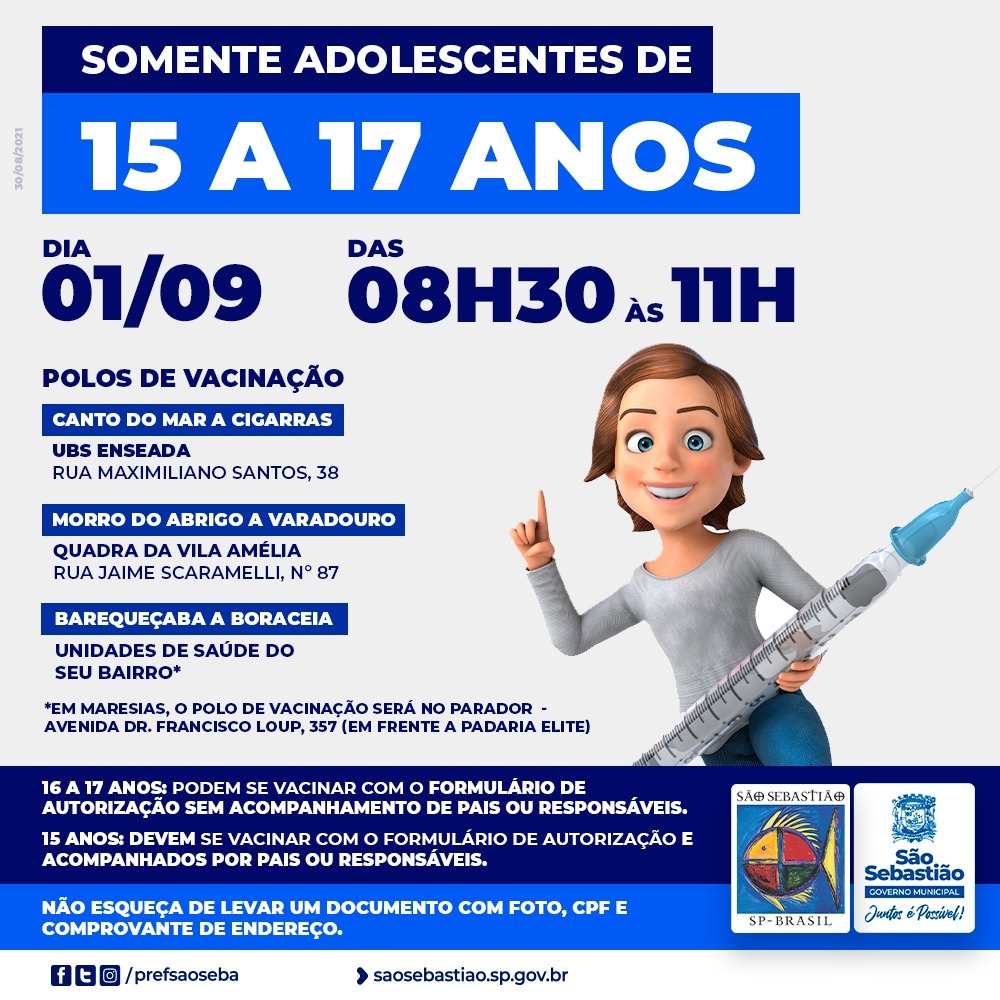 A Prefeitura de São Sebastião, por meio da Secretaria de Saúde (SESAU) e da Fundação de Saúde Pública (FSPSS), com apoio da Secretaria da Educação (SEDUC), informa que nesta quarta-feira (1.º) a campanha de vacinação contra Covid-19 terá como público-alvo adolescentes de 15 a 17 anos.