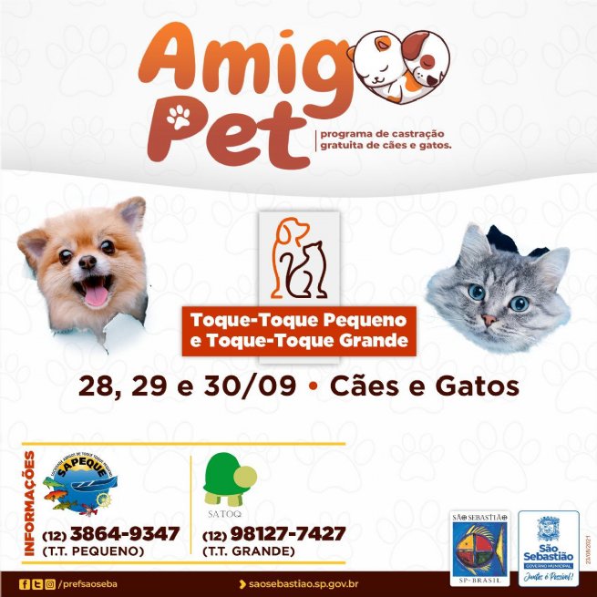 A Prefeitura de São Sebastião, por meio do Centro de Controle de Zoonoses (CCZ), dá sequência ao programa de castração gratuita Amigo Pet atendendo aos bairros de Toque Toque Pequeno e Toque Toque Grande entre os dias 28 e 30 de setembro. Nos três dias de ação, a previsão é castrar 120 animais, entre cães e gatos, machos e fêmeas.