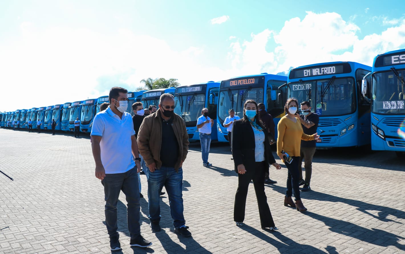 O prefeito de São Sebastião, Felipe Augusto, entregou na manhã deste domingo (1º de agosto), na Rua da Praia, centro, ônibus da frota do transporte escolar, que começam a operar nesta segunda-feira (2), com a volta às aulas presenciais.