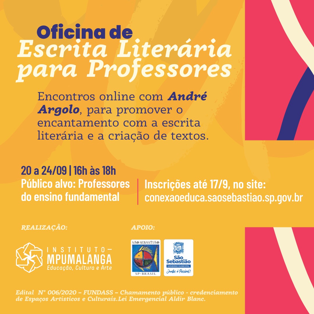 A Prefeitura de São Sebastião, por meio da Secretaria da Educação (SEDUC), em parceria com o Instituto Mpumalanga e apoio da Fundação Educacional e Cultural “Deodato Sant’Anna” (Fundass), promove a “Oficina de Escrita Literária para Professores – Poesia, para começo de conversa”, entre os dias 20 e 24 de setembro, de forma gratuita e virtual.