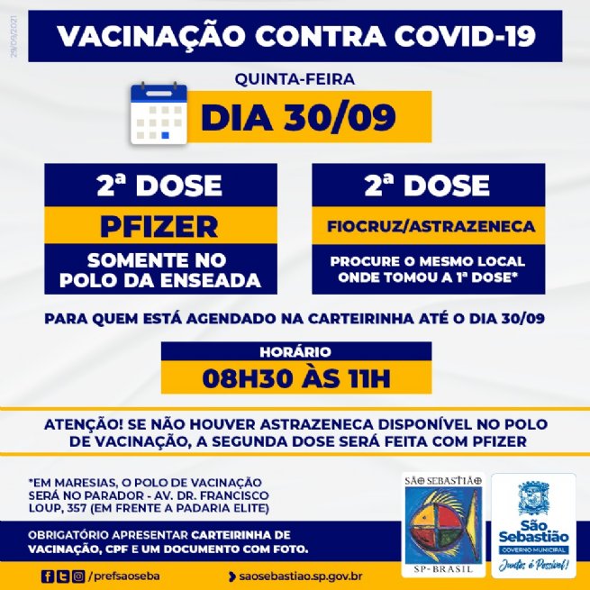 A Prefeitura de São Sebastião, por meio da Secretaria de Saúde (SESAU) e da Fundação de Saúde Pública (FSPSS), comunica que, nesta quinta-feira (30), das 8h30 às 11h, haverá aplicação de segunda dose contra Covid-19 para vacinados com Pfizer ou Fiocruz/Astrazeneca e agendados na carteirinha de vacinação até 30 de setembro.