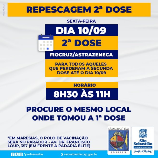 A Prefeitura de São Sebastião, por meio da Secretaria de Saúde (SESAU) e da Fundação de Saúde Pública (FSPSS), informa que, nesta sexta-feira (10), haverá aplicação de segunda dose de Fiocruz/Astrazeneca para pessoas agendadas, no comprovante de vacinação, em 10 de setembro ou datas anteriores.