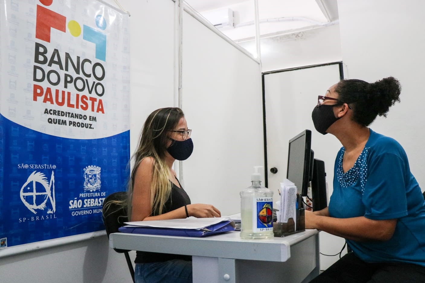#PraTodosVerem: foto mostra atendimento no Banco do Povo Paulista no Posto SEBRAE – AQUI da Prefeitura de São Sebastião. Fim da descrição.
