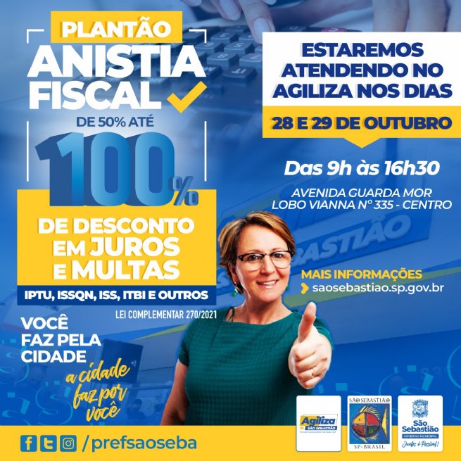 O Agiliza São Sebastião estará funcionando nos dias 28 e 29 de outubro, somente para atendimentos referentes à anistia fiscal e serviços da Sabesp.