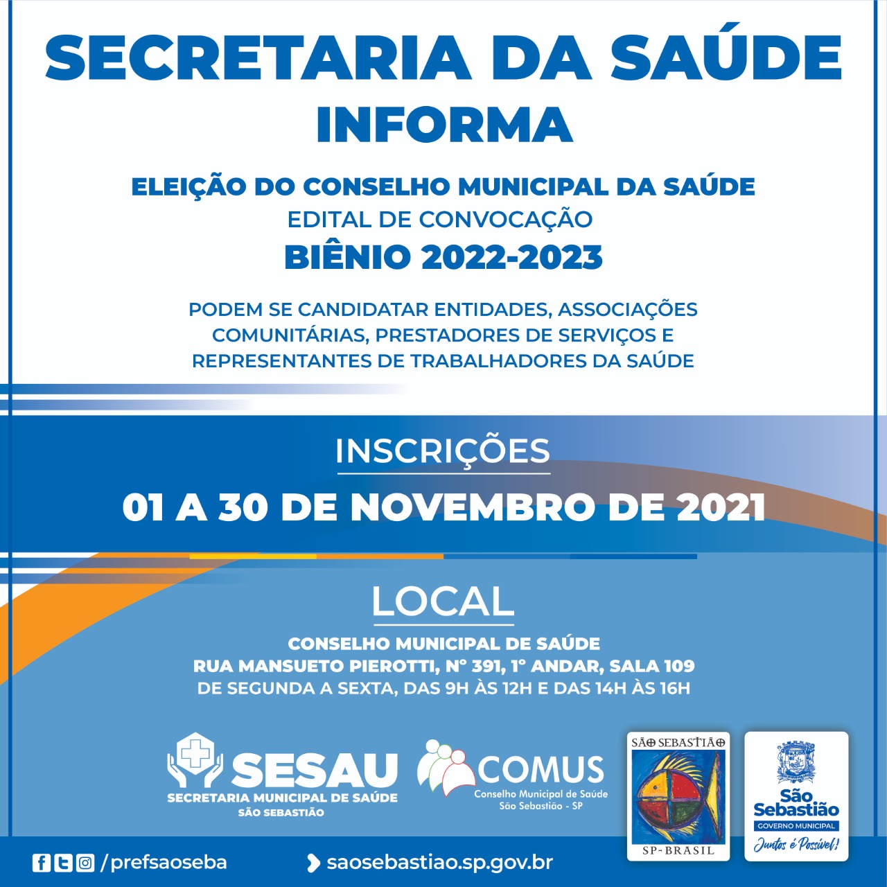 A Prefeitura de São Sebastião, por meio da Secretaria de Saúde (SESAU), divulgou o Edital de Convocação da Eleição do Conselho Municipal da Saúde (COMUS) – Biênio 2022-2023, aprovado na 179ª reunião extraordinária do referido colegiado.