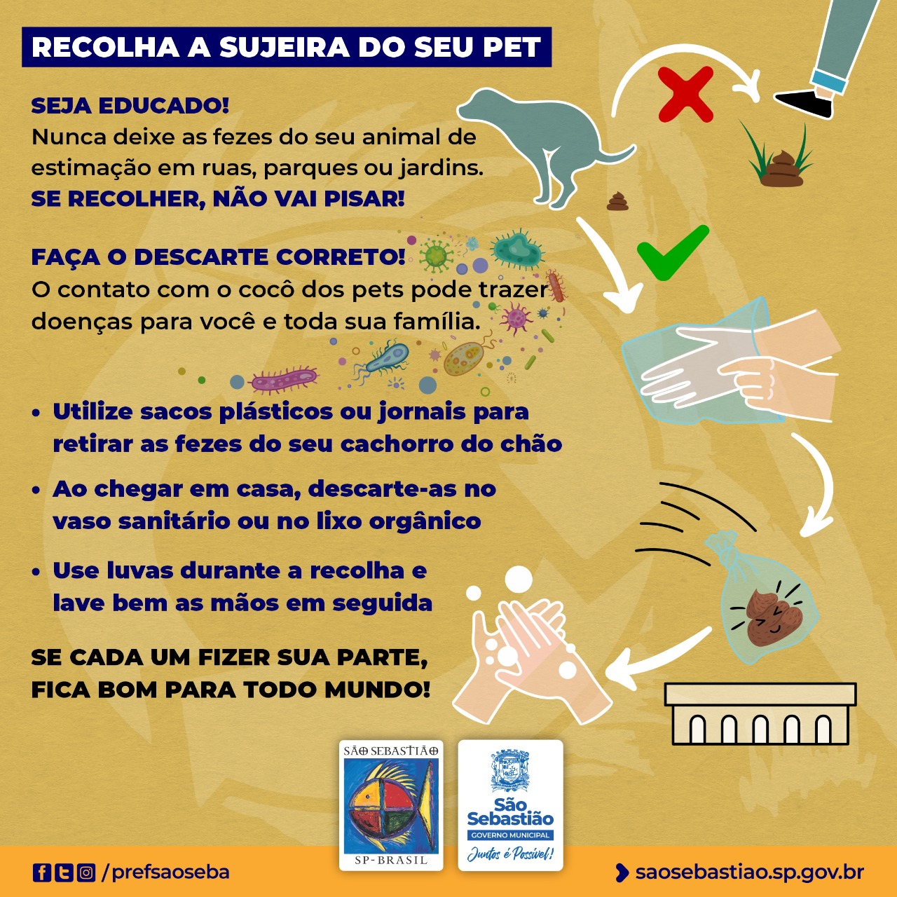 A Prefeitura de São Sebastião, por meio da Secretaria do Meio Ambiente (SEMAM), está realizando uma campanha para estimular os donos de pets a retirarem as fezes dos seus animais de estimação das ruas e espaços públicos, uma atitude educada e que pode prevenir doenças.