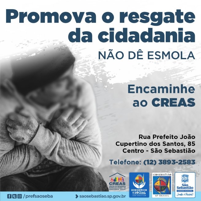 A Prefeitura de São Sebastião, por meio da Secretaria de Desenvolvimento Econômico e Social (SEDES), Centro de Referência Especializado de Assistência Social (CREAS) lança a campanha “Promova o resgate da cidadania. Não dê esmolas. Encaminhe ao CREAS”, voltada a população de rua.