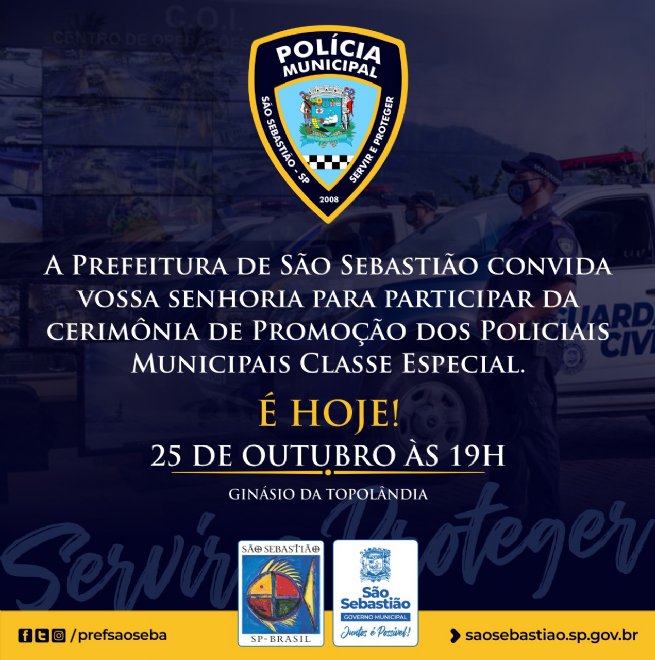 A Prefeitura de São Sebastião, por meio da Secretaria de Segurança Urbana (SEGUR), informa que ocorre a Cerimônia de Promoção dos Policiais Municipais Classe Especial, nesta segunda-feira (25).