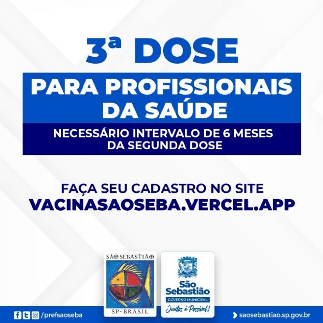 A Prefeitura de São Sebastião, por meio da Secretaria de Saúde (SESAU) e da Fundação de Saúde Pública (FSPSS), informa que os profissionais de saúde, tanto da rede pública quanto privada, que tomaram a segunda dose da vacina contra a Covid-19 há pelo menos seis meses poderão receber a terceira dose (reforço) nesta sexta-feira (22). Para isso, se faz necessário realizar, com antecedência, um cadastro na Central da Vacina, por meio do link vacinasaoseba.vercel.app.