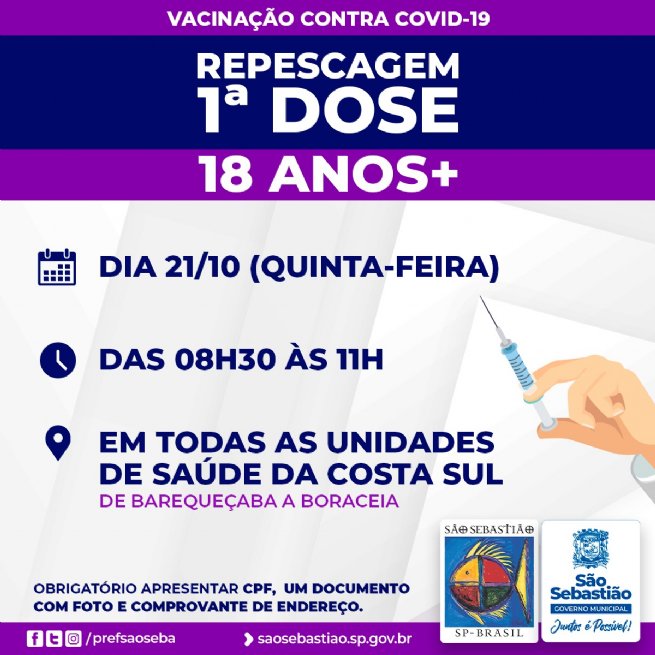 A Prefeitura de São Sebastião, por meio da Secretaria de Saúde (SESAU) e da Fundação de Saúde Pública (FSPSS), fará aplicação de primeira dose contra Covid-19 para pessoas com 18 anos ou mais. A repescagem será nesta quinta-feira (21), das 8h30 às 11h, nas Unidades de Saúde da Família (USFs) de Barequeçaba a Boraceia, na Costa Sul.