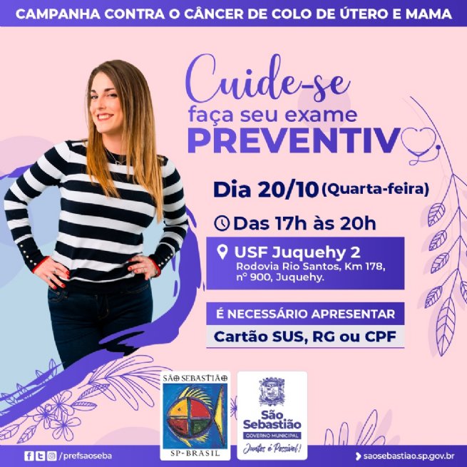 Integrando a programação do Outubro Rosa, a Unidade de Saúde da Família (USF) de Juquehy 2 realiza, nesta quarta-feira (20), Campanha Contra o Câncer de Colo do Útero e Mama, com o tema “Cuide-se, faça seu exame preventivo”. Será nesta quarta-feira (20), das 17h às 20h, na USF Juquehy 2, localizada na Rodovia Rio Santos, Km 178, n.º 900, em Juquehy.