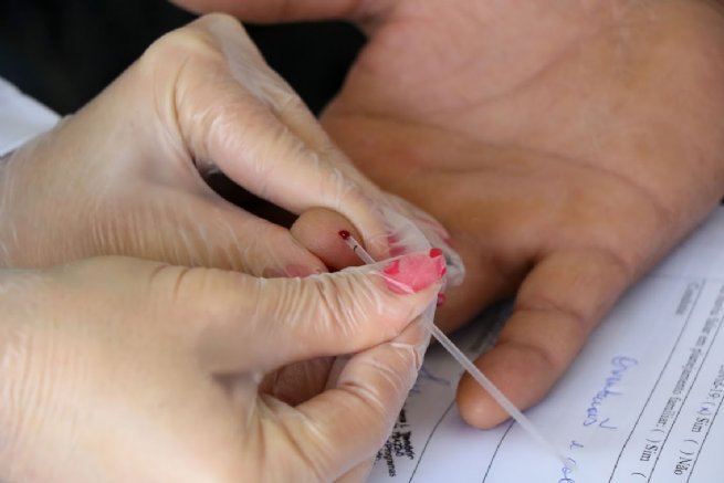 #PraTodosVerem: foto de coleta de sangue para realização de teste rápido para detecção de Sífilis. Fim da descrição.