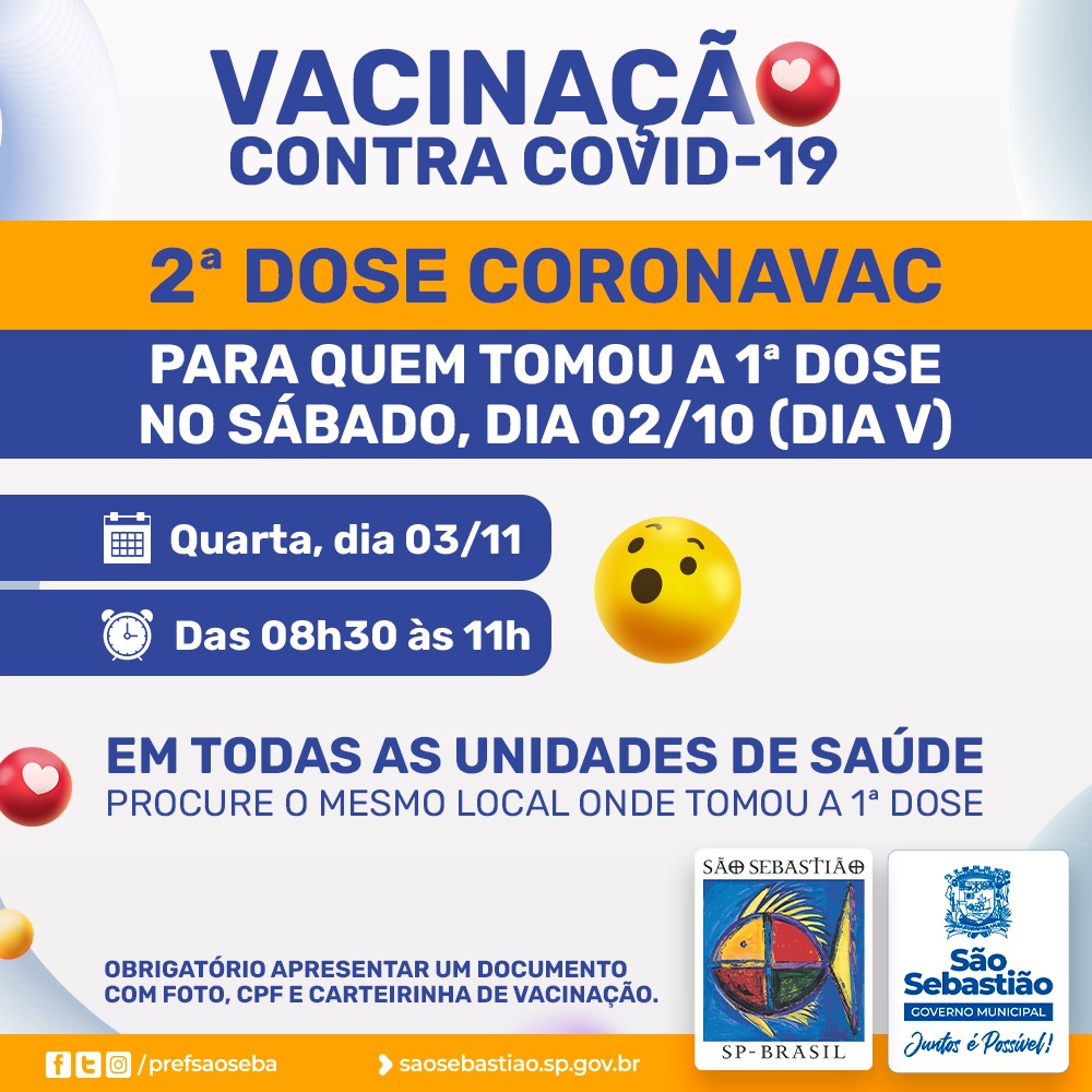 A Prefeitura de São Sebastião, por meio da Secretaria de Saúde (SESAU) e da Fundação de Saúde Pública (FSPSS), fará, nesta quarta-feira (03), aplicação da segunda dose da vacina Coronavac contra Covid-19 para quem tomou a primeira dose no dia 02 de outubro na Campanha do Dia V de Vacinação.