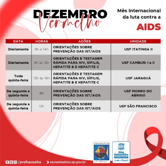 A Prefeitura de São Sebastião, por meio da Secretaria de Saúde (SESAU) e Fundação de Saúde Pública (FSPSS), promove, durante o mês de dezembro, ações de conscientização e prevenção às Infecções Sexualmente Transmissíveis (ISTs), HIV e Aids.