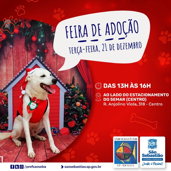 A Prefeitura de São Sebastião, por meio do Centro de Controle de Zoonoses (CCZ), vinculado à Secretaria de Saúde (SESAU), realiza, nesta terça-feira (21), mais uma edição da Feira de Adoção de Cães. O evento será das 13h às 16h ao lado do Estacionamento do Supermercado Semar, na Rua Anjolino Viola, n.º 318, no Centro. Em caso de chuva, o evento poderá ser cancelado.