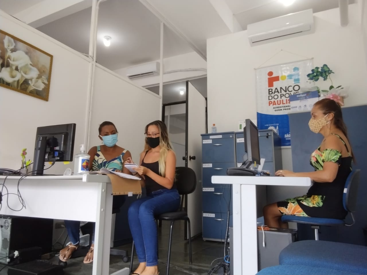 #PraTodosVerem: foto mostra atendimento no Banco do Povo, Prefeitura de São Sebastião, Secretaria de Desenvolvimento Econômico e Social (SEDES), Departamento de Emprego e Renda. Fim da descrição.