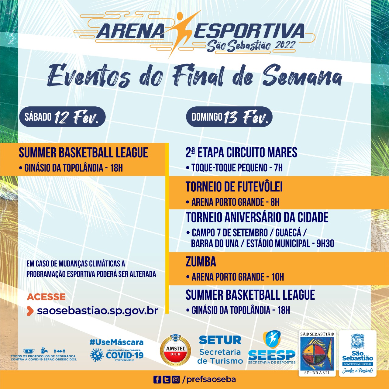 A Prefeitura de São Sebastião, por meio da Secretaria de Esportes (SEESP), tem proporcionado diariamente atividades esportivas abertas ao público, competições e apoios a eventos esportivos até 27 de fevereiro.