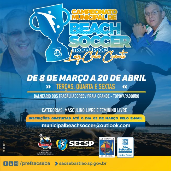 A Prefeitura de São Sebastião, por meio da Secretaria de Esportes (SEESP), abre inscrições para o Campeonato Municipal de Beach Soccer – Troféu Prof. Luiz Carlos Cavinati, evento em memória e homenagem ao professor de educação física que liderou gerações de equipes de futsal.