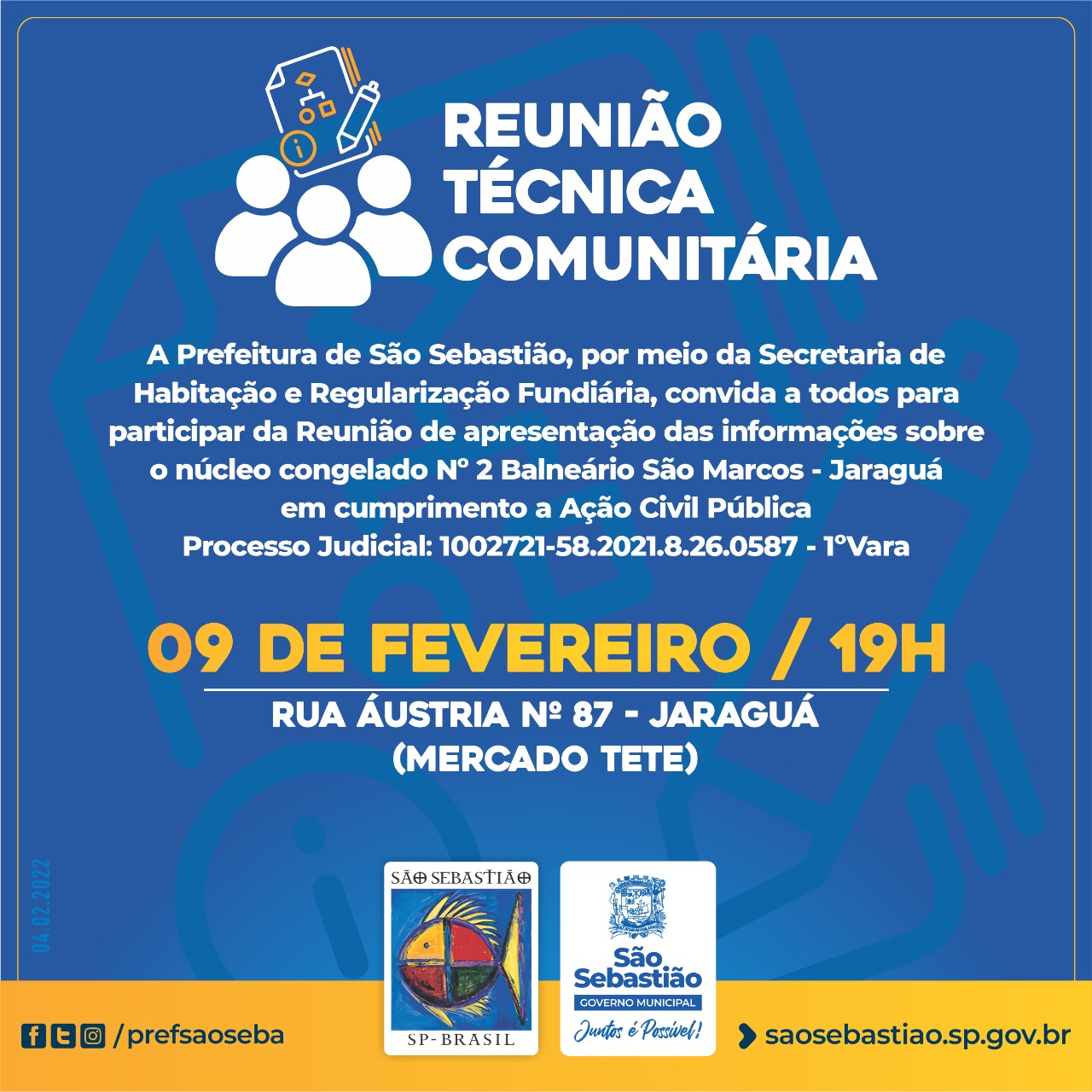 A Prefeitura de São Sebastião, por meio da Secretaria de Habitação e Regularização Fundiária (SEHAB) vai realizar nesta quarta-feira (09), às 19h, na Rua Áustria, 87 (Mercado do Tete), bairro Jaraguá, reunião técnica comunitária, em cumprimento a Ação Civil Pública, processo judicial número 1002721-58.2021.8.26.0587.