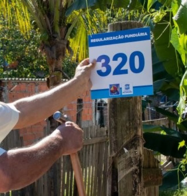 #PraTodosVerem: foto com destaque em uma placa de regularização fundiária sendo instalada. Fim da descrição.