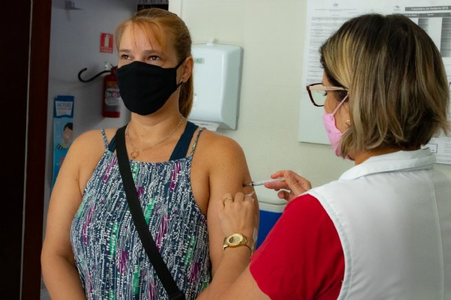 #PraTodosVerem: foto de profissional da Saúde aplicando vacina contra a Covid-19 em munícipe na Unidades de Saúde da Família (USF) da Vila Amélia. Fim da descrição.