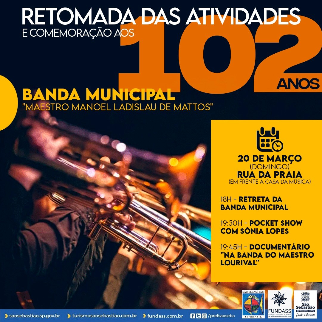 Neste domingo (27), às 18h, a Banda Municipal de São Sebastião “Maestro Manoel Ladislau de Mattos” retoma suas atividades e se apresenta em frente à Casa da Música, na Rua da Praia, em comemoração ao aniversário de 102 anos da corporação.