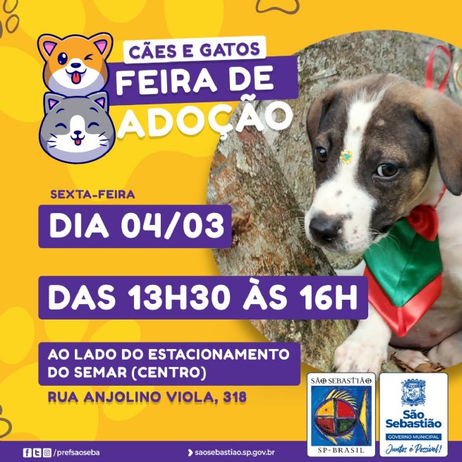 A Prefeitura de São Sebastião, por meio do Centro de Controle de Zoonoses (CCZ), vinculado à Secretaria de Saúde (SESAU), realiza, nesta sexta-feira (4), mais uma Feira de Adoção de Cães e Gatos. Será das 13h30 às 16h ao lado do Estacionamento do Supermercado Semar, na Rua Anjolino Viola, n.º 318, no Centro.