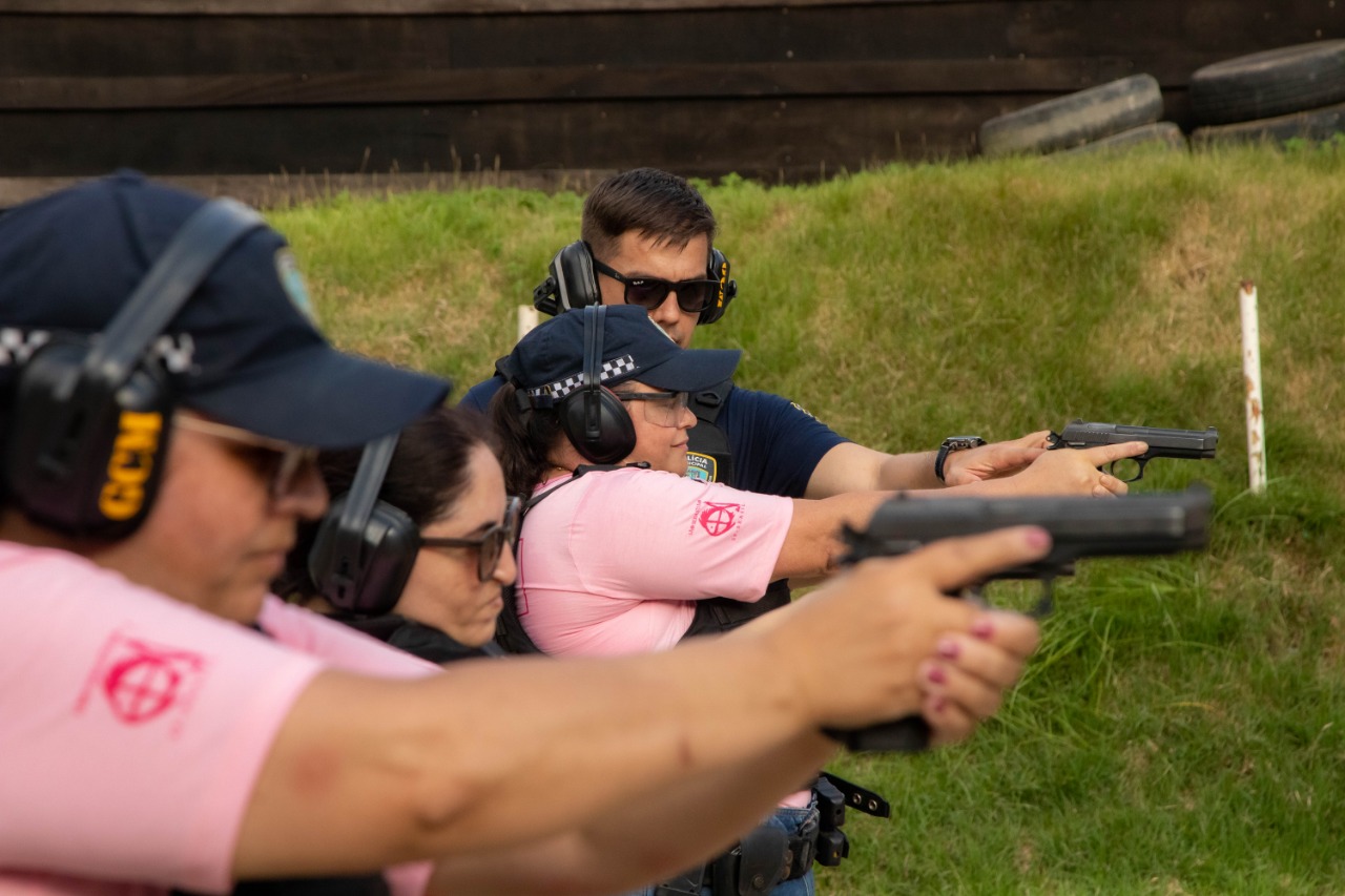 #PraTodosVerem: fotos das policiais municipais femininas em treinamento de tiro. Fim da descrição.