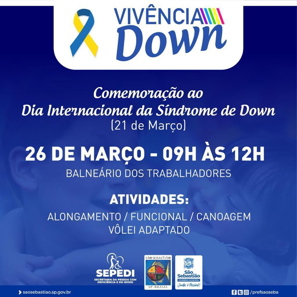 Neste sábado (26), a Prefeitura de São Sebastião, por meio das secretarias da Pessoa com Deficiência e do Idoso (SEPEDI) e da Educação (SEDUC), com apoio de Esportes (SEESP), promove o Vivência Down, evento em homenagem ao Dia Internacional da Síndrome de Down, comemorado em 21 de março.