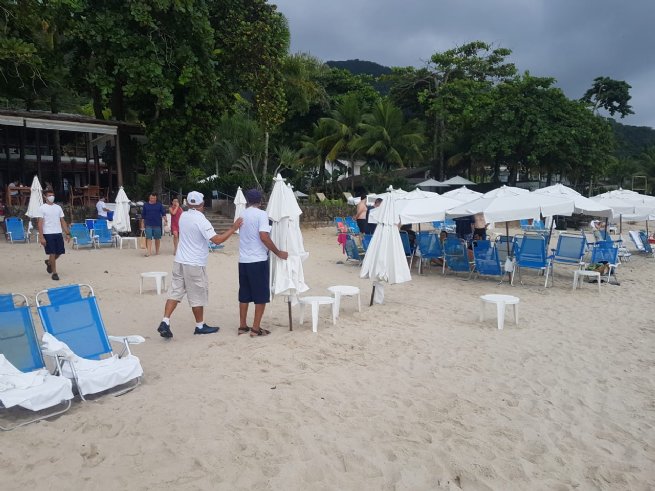 Já em Juquehy, Cambury e Maresias foram encontradas, novamente, barracas e cadeiras dispostas na areia, sem uso.