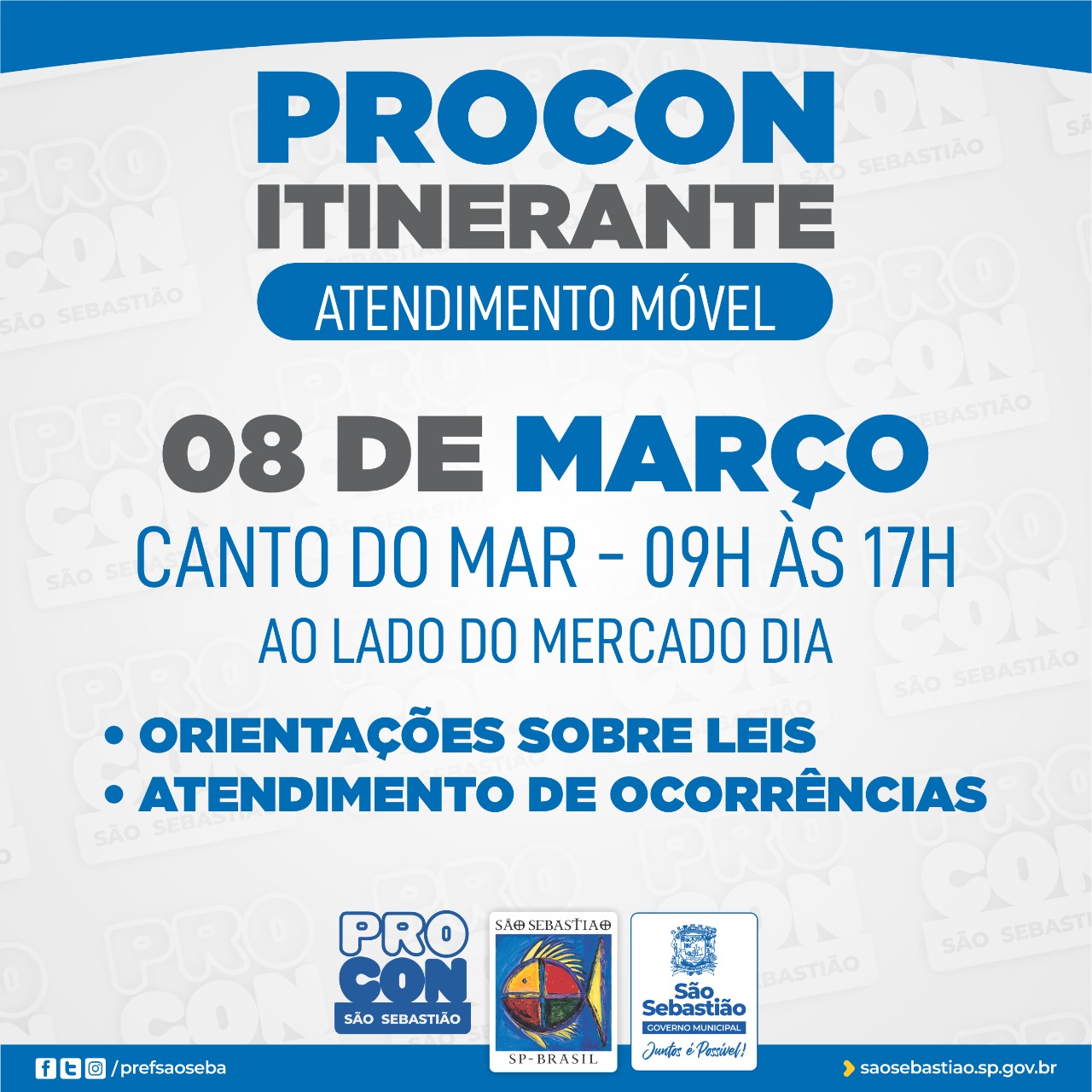 A Prefeitura de São Sebastião, por meio do Procon, vinculado à Secretaria de Assuntos Jurídicos (SAJUR), estará realizando a campanha “Procon Itinerante”, no dia 08 de março, para atendimento de munícipes da Costa Norte.