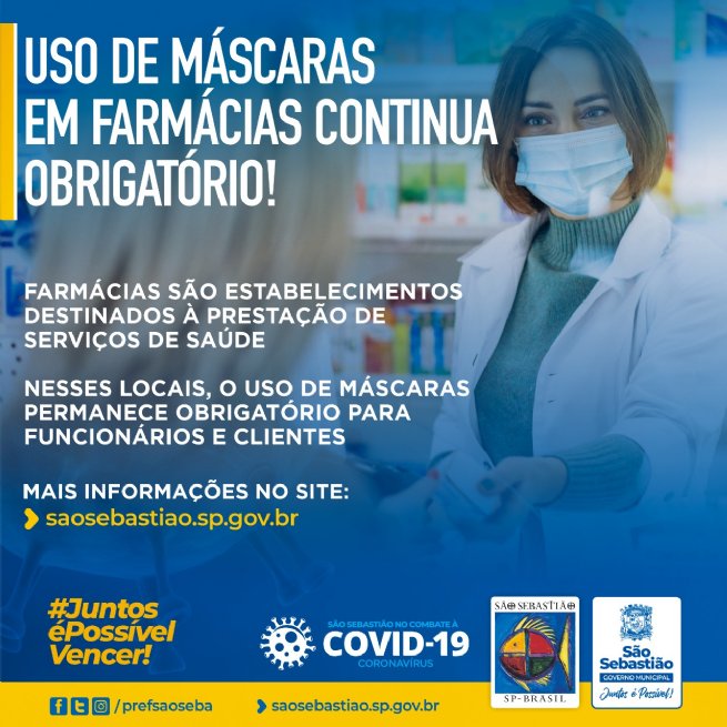 A Prefeitura de São Sebastião, por meio da Secretaria de Saúde (SESAU), informa que a utilização de máscaras de proteção facial em farmácias e drogarias, tanto públicas quanto privadas, por funcionários e clientes, permanece obrigatório.