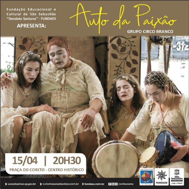 Nesta sexta-feira (15), às 20h30, o grupo Circo Branco apresenta na Praça do Coreto, Centro Histórico, o espetáculo teatral “Auto da Paixão”, promovido pela Prefeitura de São Sebastião, por meio da Fundação Educacional e Cultural “Deodato Sant’Anna” (Fundass).