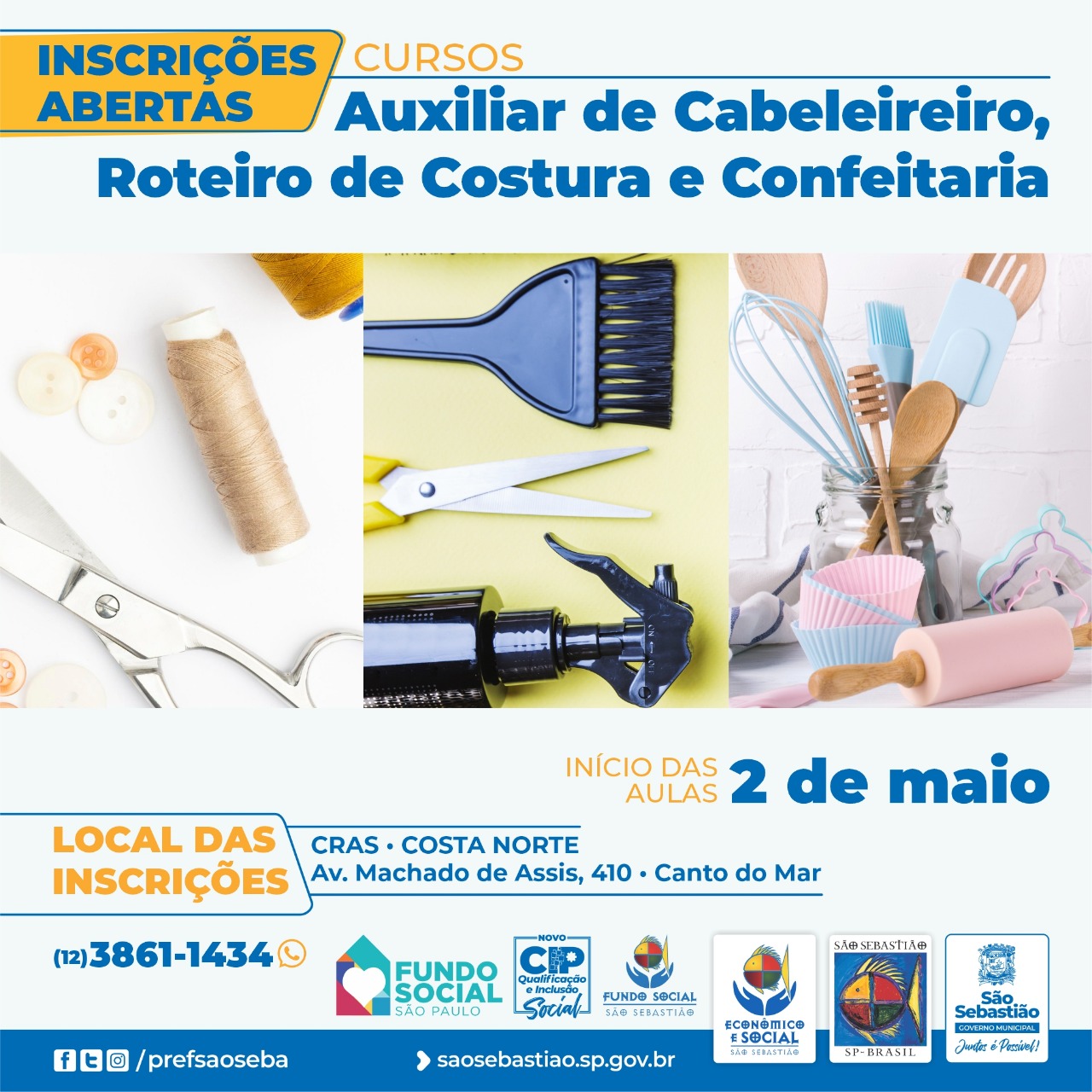 #PraTodosVerem: arte com informações referentes aos cursos gratuitos ‘Auxiliar de Cabelereiro’, ‘Confeitaria’ e ‘Roteiro de Costura’ que serão realizados pela Prefeitura de São Sebastião, Secretaria de Desenvolvimento Econômico e Social (SEDES), Centro Integrado Profissionalizante (CIP) e Fundo Social. Fim da descrição.
