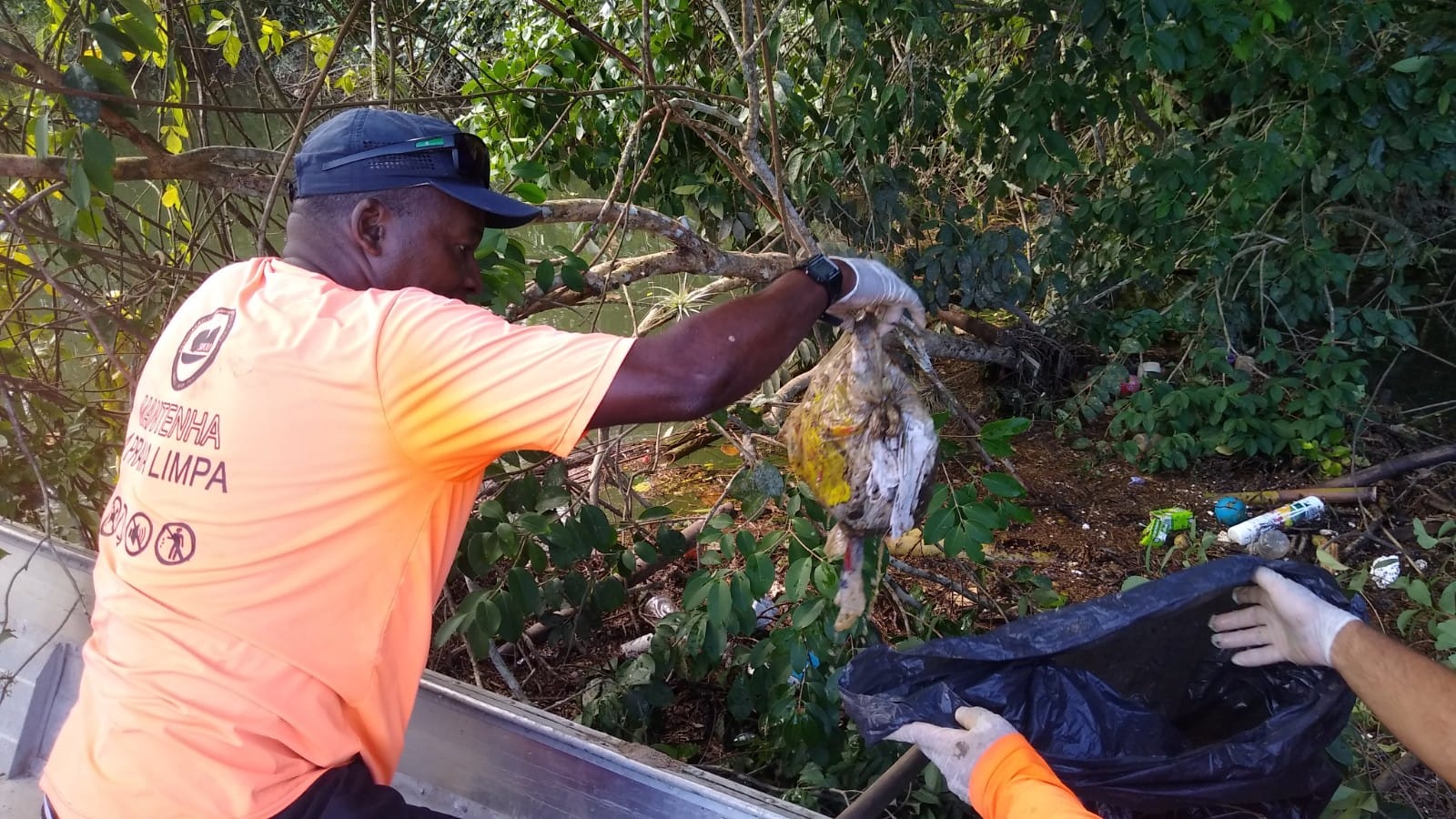 #PraTodosVerem: sequência de fotos mostra ação de limpeza de manguezal no bairro Juquehy. Fim da descrição.