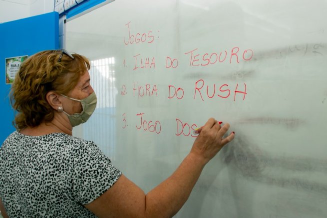 #PraTodosVerem: foto mostra professora e alunos da rede municipal de ensino em sala de aula. Fim da descrição.