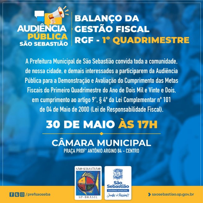 A Prefeitura de São Sebastião, por meio da Secretaria da Fazenda (SEFAZ), informa que no dia 30 de maio, às 17h, ocorre a audiência pública para demonstração e avaliação do cumprimento das metas fiscais do primeiro quadrimestre de 2022 referentes à Lei Orçamentária Anual (LOA).