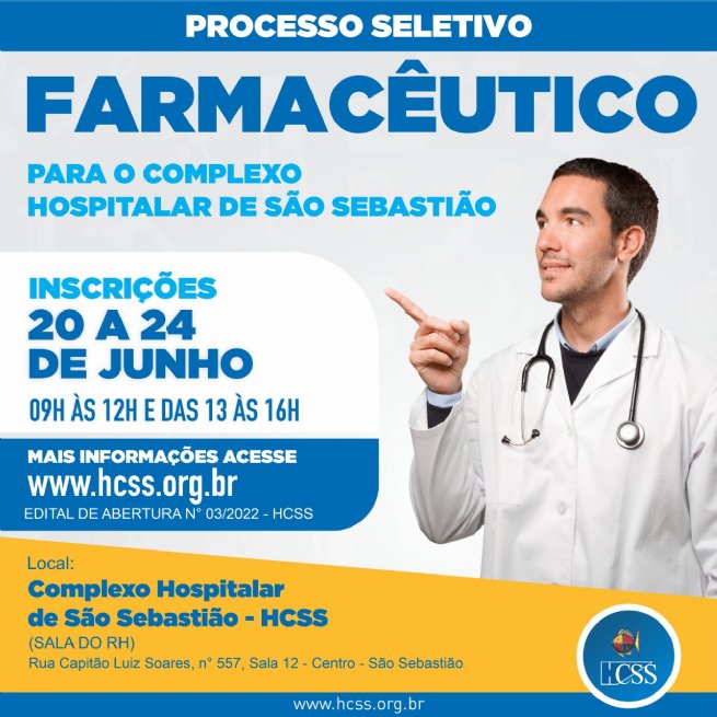 O Hospital de Clínicas de São Sebastião (HCSS) abre inscrições para processo simplificado de seleção e recrutamento visando contratação de farmacêutico, pelo período de um ano, prorrogável por mais um ano, para atuar no Complexo Hospitalar do município.