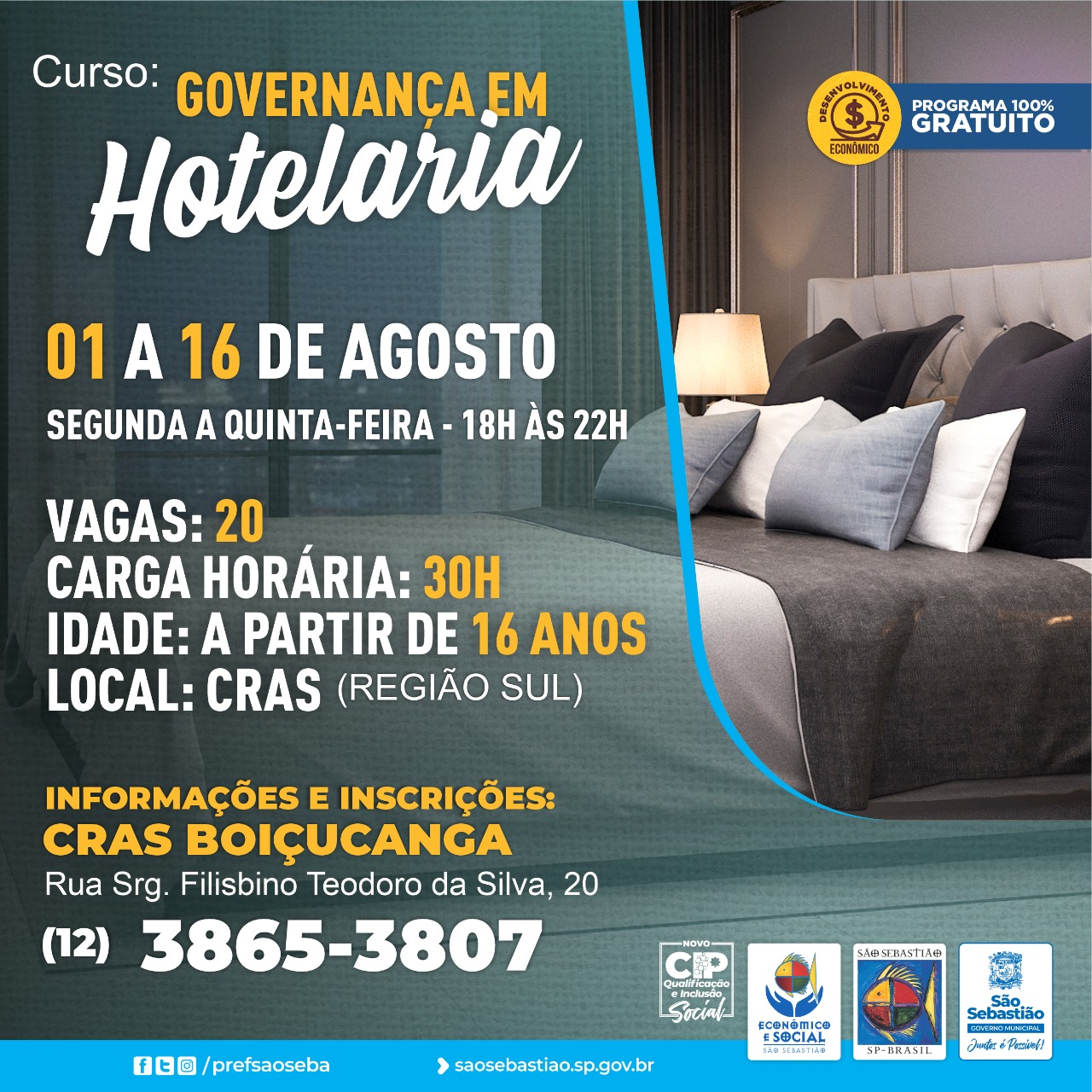 A Prefeitura de São Sebastião, por meio da Secretaria de Desenvolvimento Econômico e Social (SEDES), Centro Integrado Profissionalizante (CIP) está com inscrições abertas aos cursos presenciais gratuitos profissionalizantes ‘Governança em Hotelaria’, ‘Designer de Sobrancelha e Maquiagem’, ‘Português para Concurso’, ‘Atendente de Loja – Técnicas de Vendas’, Atendente de Farmácia’ e ‘Atendente de Padaria’, destinados a moradores, maiores de 16 anos, da Costa Sul do município.