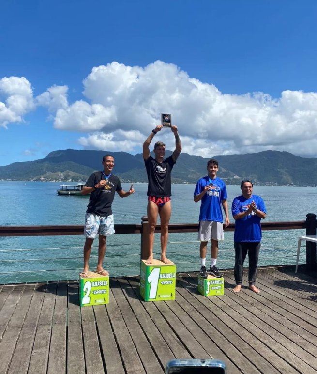 #ParaTodosVerem: imagens do nadador sebastianense, Gabriel Abella, 24 anos, que é contemplado pelo “Força Atleta”, programa criado pela Prefeitura de São Sebastião, por meio da Secretaria de Esportes, que apoia os atletas do município. Gabriel conquistou o terceiro lugar da categoria 20/24 do Campeonato Píer à Píer, em Ilhabela, neste último final de semana. Fim de descrição.