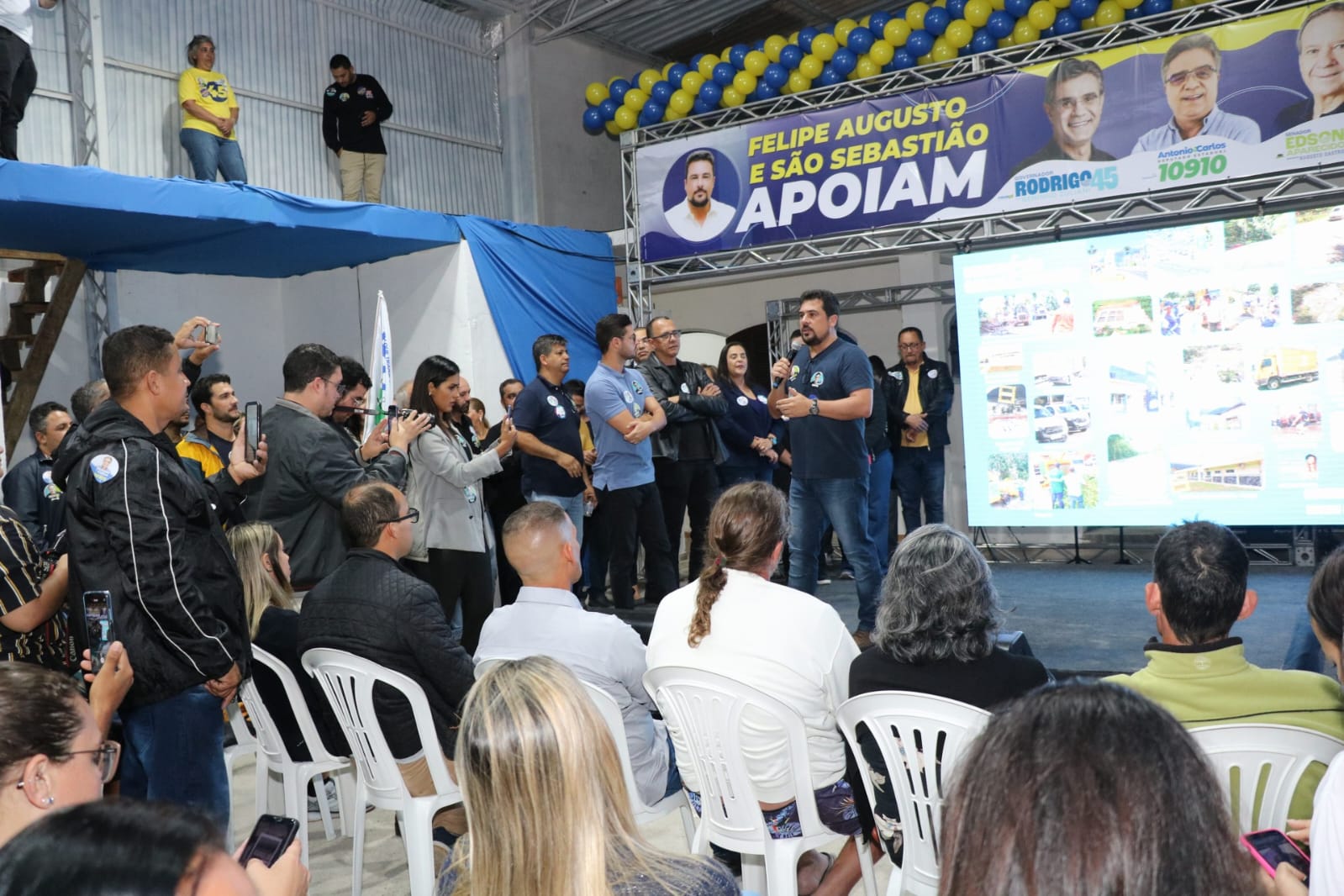 O prefeito de São Sebastião, Felipe Augusto, realizou, na noite desta quarta-feira (14), reunião no Comitê do PSDB, na Avenida Guarda Mor Lobo Vianna, no Porto Grande, região central, com aproximadamente 500 apoiadores de candidatos da campanha da eleição de 2 de outubro. No evento da “Arrancada da Vitória”, Felipe Augusto falou sobre o seu apoio à campanha para governador, de Rodrigo Garcia (45), para deputado estadual, com Antonio Carlos da Silva (10910), e para o senador, com o ex-secretário de Saúde, Edson Aparecido(155), e dos deputados federais.