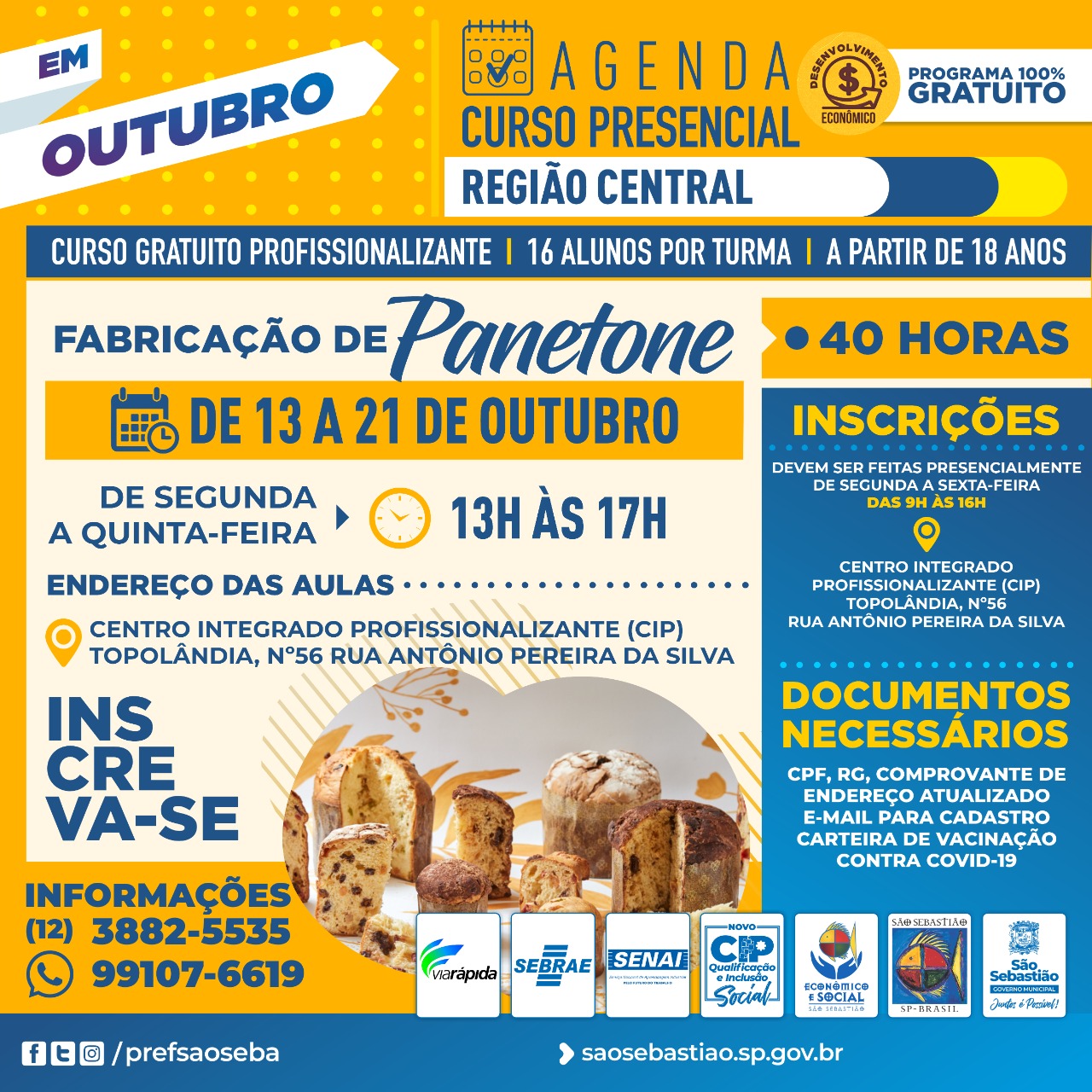 A Prefeitura de São Sebastião, por meio da Secretaria de Desenvolvimento Econômico e Social (SEDES), Centro Integrado Profissionalizante (CIP), em parceria com o Programa Empreenda Rápido do Serviço Brasileiro de Apoio às Micro e Pequenas Empresas (SEBRAE), Governo do Estado de São Paulo e Serviço Nacional de Aprendizagem Industrial (SENAI) informa que estão abertas as inscrições para os cursos profissionalizantes gratuitos de ‘Fabricação de Panetone’ e ‘Produtos de Confeitaria’.